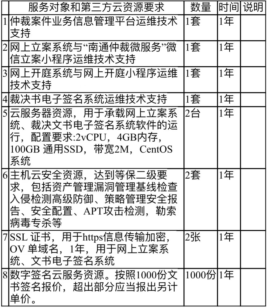 因工作需要,南通仲裁委员会秘书处以询价采购的方式,为目前使用的智慧仲裁平台采购运维服务,欢迎供应商前来参加询价采购活动。 一、询价概况 1、询价单位:南通仲裁委员会秘书处 2、项目名称:智慧仲裁平台运维服务 3、询价内容:详见附件《维护清单》 4、询价方式:询价采购 5、项目预算:8.8万元,超过采购预算的报价无效。 6、服务时间:本次项目的服务时间为签约之日起一年。 7、服务地点:南通仲裁委员会秘书处指定地点。 二、投标人资格以及要求: 报价人应符合《中华人民共和国政府采购法》第二十二条规定的条件。 三、服务要求