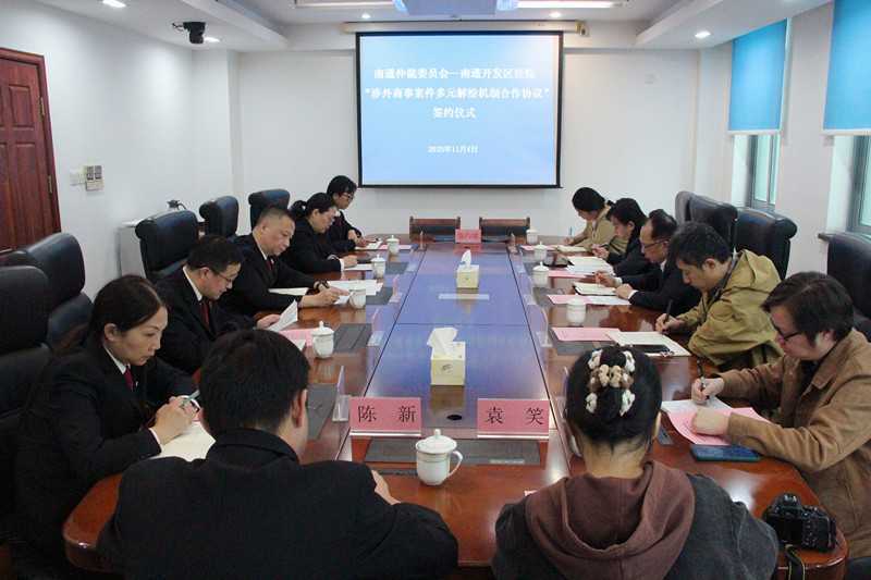 11月4日,南通仲裁委员会与南通经济开发区法院“涉外商事案件多元解纷机制合作协议”签约仪式在开发区法院举行。南通仲裁委员会副主任、秘书长王峥、南通开发区法院党组书记、院长任智峰出席,开发区法院党组成员、副院长陶新琴主持活动。 签约仪式上,开发区法院党组成员、审判委员会专职委员侯敬华首先介绍了自2023年集中管辖南通市一审涉外及涉港澳台商事案件以来的审判工作情况及成效。随后,南通仲裁委员会业务科科长杨静介绍了涉外商事仲裁调解工作及诉仲对接流程,重点围绕基本情况和涉外仲裁重点工作展开。 在双方代表签署合作协议后,王峥在讲话中指出,此次签约是司法与仲裁深化协作的重要里程碑,更是服务优化营商环境的创新举措。他强调,高效化解涉外商事纠纷是保障涉外经贸活动、提升城市竞争力的关键支撑。下一步将着力推进三方面工作:一是健全诉仲对接流程,实现法院受理、仲裁调解前置,调解不成则仲裁裁决或法院判决结案的顺畅衔接;二是强化专业资源共享,整合法律适用、案例研究、人才培养等优势,提升纠纷解决质效;三是深化新仲裁法实施后的机制创新,探索更具针对性、灵活性的合作模式,满足涉外当事人实际需求。王峥表示,此次合作是理念契合、资源整合、效能提升的深度融合,双方将共同打造诉讼与仲裁衔接的多元解纷“优选渠道”,为南通经济高质量发展筑牢法治屏障。
